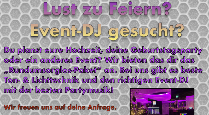 Lust zu Feiern? DJ gesucht? Angebot DJ Event Musikanlage Rundumsorglos-Paket06/06/202106/06/2021 SC Keine Kommentare Hier ist die Lösung: -> Hier geht es zum DJ-Service. Weiterlesen