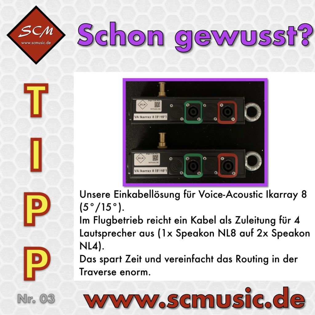 Unsere Einkabellösung für das Ikarray 8 (5°/15°) von Voice-Acoustic. Im Flugbetrieb reicht ein Kabel als Zuleitung für 4 Lautsprecher aus (1x Speakon NL8 auf 2x Speakon NL4). Das spart Zeit und vereinfacht das Routing in der Traverse enorm.