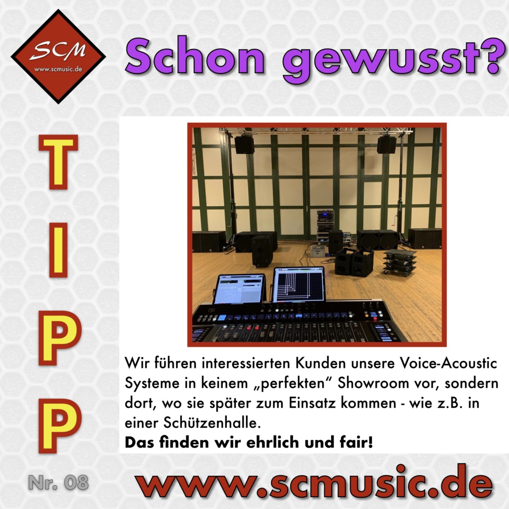 Hochwertige Tonsysteme sind (leider) nicht günstig, aber jeden Cent wert. Wir führen interessierten Kunden unsere Systeme unter Realbedingungen vor und beantworten gerne Fragen zur Technik. Besonders gerne stellen wir uns dem A/B-Vergleich. Dazu bringt der Kunde eine Vergleichs-PA mit und wir testen gemeinsam die Systeme.