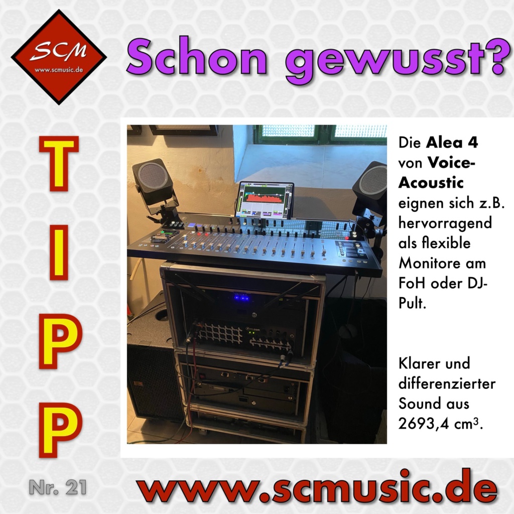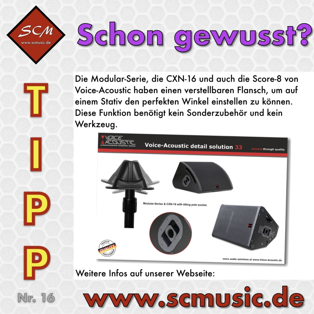 Die Score-Serie von Voice-Acoustic lässt sich durch ihre multifunktionale Halterung auf Stativen oder an Traversen befestigen und werkzeuglos optimal auf den zu beschallenden Bereich ausrichten. Die Score-6 oder die Score-8 sind zudem mit einem verstellbaren Flansch ausgestattet (siehe auch Tipp 16).