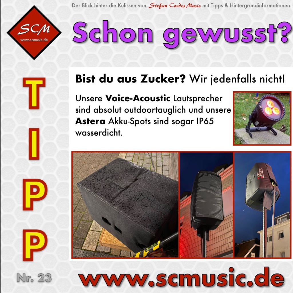 Unsere Lautsprecher sind outdoor-tauglich. Sowohl die Lautsprecherkomponenten als auch die Gehäuse sind geschützt. Dennoch geben die Transport- und Regenschutzhüllen einen zusätzlichen Schutz vor Wasser und Dreck. Auch unsere Akku-Spots von Astra sind IP65! Dies macht unser Material sehr flexibel beim Einsatz – egal an welchem Ort!