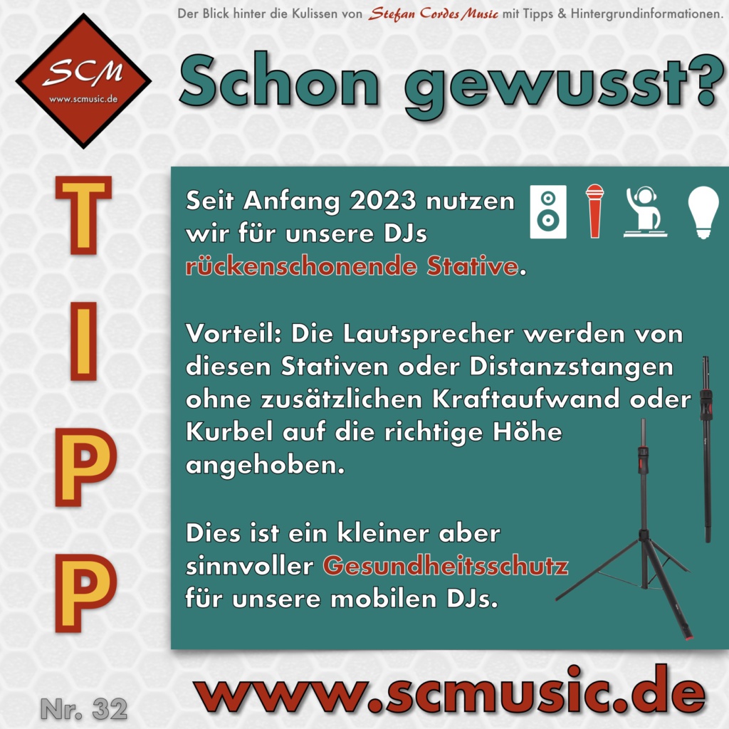Wir achten auf die Gesundheit unser DJs. Bereits sein 2023 nutzen wir rückenschonende Stative. Die Lautsprecher können, dank dieser innovativen Stative, ohne zusätzlichen Kraftaufwand auf die richtige Höhe angehoben werden.