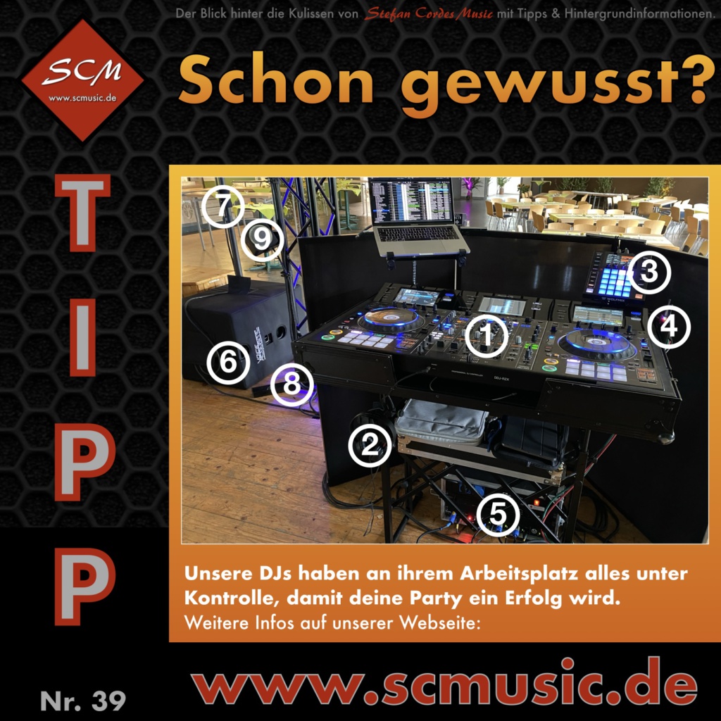 Unsere DJs haben an ihrem Arbeitsplatz alles unter Kontrolle, damit deine Party ein Erfolg wird. Kurzüberblick: 1) DJ-Console, 2) stabiler DJ-Tisch, 3) Lichtsteuerung, 4) Funksteuerung Uplight, 5) DMX-Verteiler, 6) Subbass, 7) Stativ mit Lautsprecher 8) Traversenstempel mit Licht und 9) Monitoring